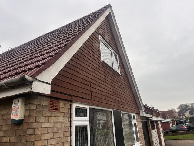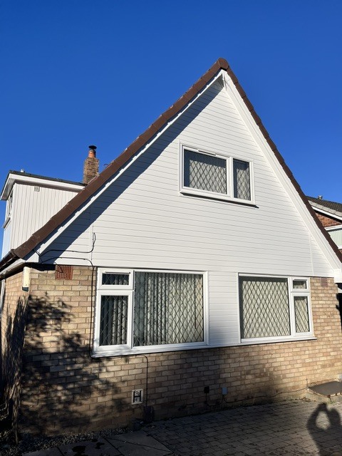The project involved the full replacement of timber fascias and soffits, installation of new uPVC roofline systems, renewal of cladding panels, and corrective work to failing cement bedding on the gables. The outcome was a durable, low-maintenance roofline solution that restored both the appearance and weather protection of the home.